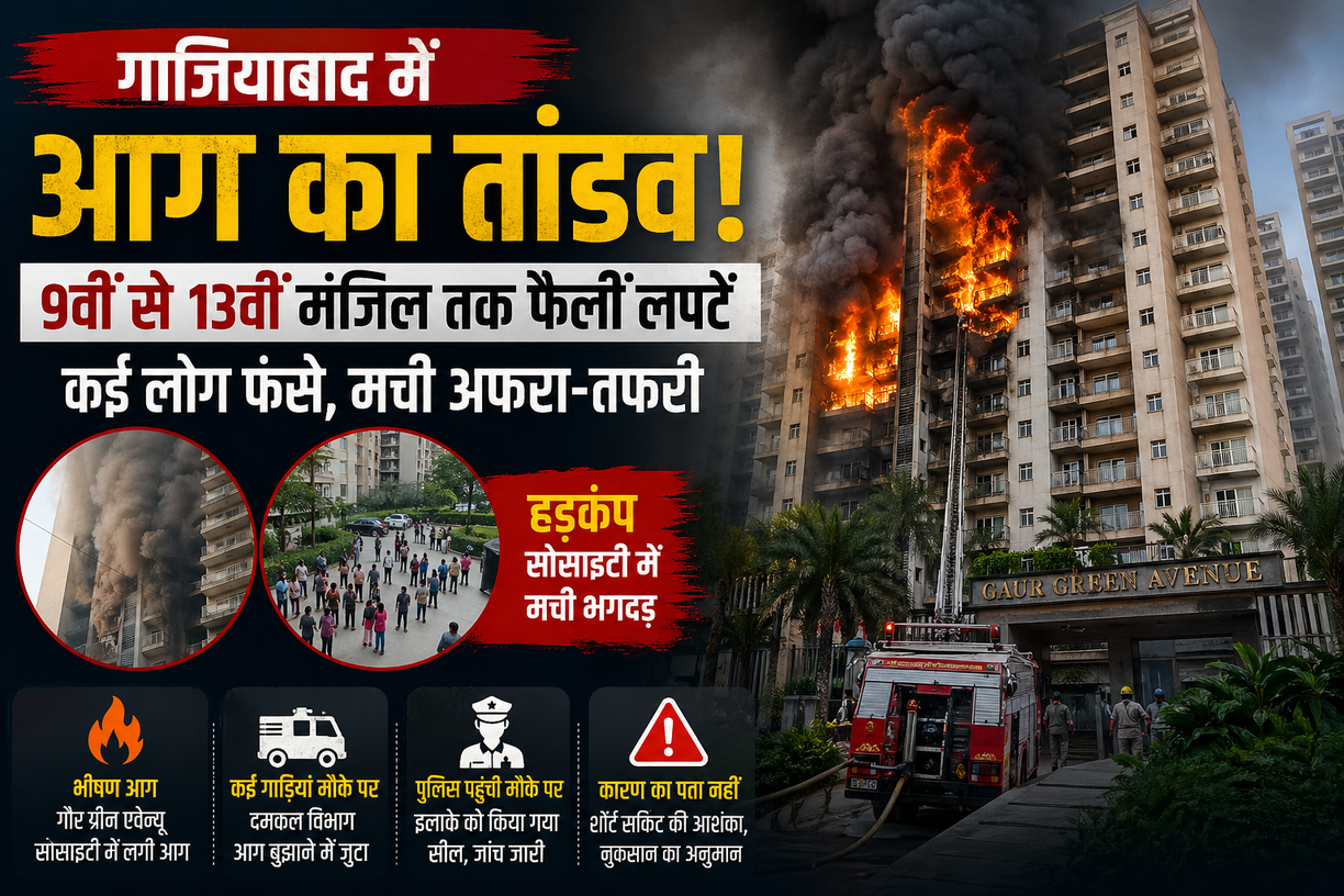 उत्तर प्रदेश के गाजियाबाद (Gaziyabad Fire) से एक बड़ी और चिंताजनक खबर सामने आई है। इंदिरापुरम क्षेत्र के अभय खंड स्थित गौर ग्रीन एवेन्यू सोसाइटी में बुधवार शाम अचानक भीषण आग लग गई, जिसने कुछ ही मिनटों में विकराल रूप ले लिया। आग इतनी तेजी से फैली कि देखते ही देखते 9वीं से 13वीं मंजिल तक ऊंची-ऊंची लपटें उठने लगीं और काले धुएं का गुबार दूर-दूर तक दिखाई देने लगा।