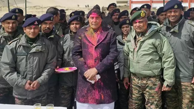֍:मेरा पहला दौरा सियाचिन का था§ֆ:राजनाथ सिंह ने कहा कि पांच साल पहले जब रक्षा मंत्रालय का दायित्व मुझे मिला था, तो उसी दिन ही मैंने प्लान किया और मेरा पहला दौरा सियाचिन का था. आज मौसम खराब होने के कारण सियाचिन जाना संभव नहीं हो पाया. इसलिए वहां तैनात सभी सैनिकों को यहीं लेह से होली की शुभकामनाएं देता हूं. रक्षा मंत्री ने कहा कि मैं अनेक अवसरों पर अपने जवानों से मिलता रहता हूं. लेकिन होली के अवसर पर आप लोगों से मिलना और आपके साथ होली खेलना, मेरे लिए सबसे सुखद क्षणों में से एक है.