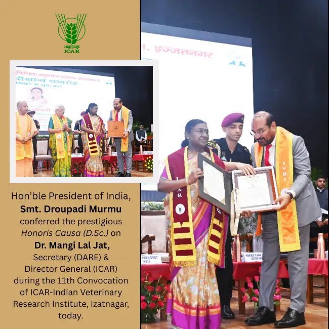 भारत की राष्ट्रपति श्रीमती द्रौपदी मुर्मु ने एक गरिमामय समारोह में भारतीय कृषि अनुसंधान परिषद (ICAR) के महानिदेशक एवं DARE के सचिव डॉ. एम.एल.जाट को मानद उपाधि – ‘डॉक्टर ऑफ साइंस’ (D.Sc. Honoris Causa) से सम्मानित किया। यह सम्मान उन्हें भारतीय पशु चिकित्सा अनुसंधान संस्थान (ICAR-IVRI), इज्जतनगर के 11वें दीक्षांत समारोह के अवसर पर प्रदान किया गया।