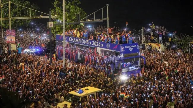 वेस्टइंडीज में टी20 वर्ल्ड कप जीत कर इतिहास रचने वाली टीम इंडिया आखिरकार अपने देश लौट ही आई और यहां उसका वैसा ही शानदार स्वागत हुआ, जिसकी उम्मीद हर किसी को थी. टीम इंडिया ने शाम को मुंबई में वानखेडे स्टेडियम तक ओपन बस में विक्ट्री परेड निकाली. इस दौरान मरीन ड्राइव पूरी तरह फैंस से खचाखच भरा पड़ा था. फिर वानखेडे स्टेडियम में टीम इंडिया का सम्मान समारोह हुआ, जहां उन्हें BCCI की ओर से 125 करोड़ रुपये का चेक मिला. इससे पहले सुबह टीम इंडिया की फ्लाइट नई दिल्ली में लैंड हुई, जहां एयरपोर्ट में उनका जोरदार स्वागत हुआ और फिर टीम ने प्रधानमंत्री नरेंद्र मोदी के साथ भी मुलाकात की.
