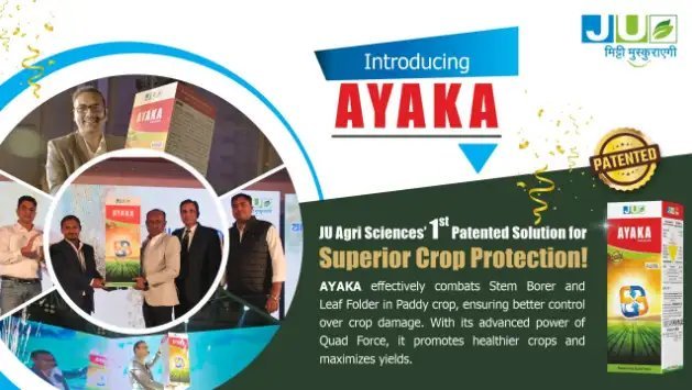 §जेयू एग्री साइंसेज प्राइवेट लिमिटेड ने भारत भर के प्रमुख रबी धान उगाने वाले बाजारों में अपना पहला इन-हाउस विकसित पेटेंटेड कीटनाशक, “अयाका” लॉन्च किया है। पेटेंटेड सिनर्जिस्टिक तकनीक से लैस यह अभिनव उत्पाद धान की फसलों में स्टेम बोरर और लीफ फोल्डर के प्रभावी प्रबंधन के लिए एक उन्नत ट्रिपल-कॉम्बिनेशन समाधान प्रदान करता है।