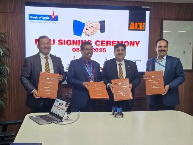 §֍:ACE – एक्शन कंस्ट्रक्शन इक्विपमेंट लिमिटेड के बारे में:§ֆ:ACE – एक्शन कंस्ट्रक्शन इक्विपमेंट लिमिटेड भारत की अग्रणी निर्माण उपकरण, ट्रैक्टर और कृषि मशीनरी निर्माता है। ACE 2WD और 4WD विकल्पों में 15 – 90 HP तक के ट्रैक्टर पेश करता है। अपनी मजबूत बनावट, ईंधन-कुशल तकनीक और लागत प्रभावी रख -रखाव के साथ ACE ट्रैक्टर किसान समुदाय में बहुत लोकप्रिय, व्यापक रूप से स्वीकृत और प्रशंसित है।§֍:बैंक ऑफ़ इंडिया के बारे में:§ֆ:बैंक ऑफ इंडिया भारत के प्रमुख राष्ट्रीयकृत बैंकों में से एक है, जिसकी स्थापना 7 सितंबर, 1906 को मुंबई में हुई। यह एक राष्ट्रव्यापी उपस्थिति वाला बैंक है, जो देश भर में अपनी विस्तृत शाखाओं के नेटवर्क के माध्यम से बैंकिंग और वित्तीय सेवाओं की एक विस्तृत श्रृंखला प्रदान करता है। बैंक व्यक्तिगत और कॉर्पोरेट दोनों ग्राहकों की जरूरतों को पूरा करता है, जिसमें जमा खाते, ऋण, निवेश और अन्य वित्तीय उत्पाद शामिल हैं। बैंक ऑफ इंडिया एक सार्वजनिक क्षेत्र का बैंक है और भारतीय अर्थव्यवस्था के विकास में एक महत्वपूर्ण स्तंभ रहा है, जो ग्राहक सेवा और नवाचार के प्रति अपनी प्रतिबद्धता के लिए जाना जाता है।§महाराष्ट्र, देश की अग्रणी निर्माण उपकरण, ट्रैक्टर और कृषि मशीनरी निर्माता एक्शन कंस्ट्रक्शन इक्विपमेंट लिमिटेड (ACE) और बैंक ऑफ़ इंडिया ने एक महत्वपूर्ण समझौता ज्ञापन (MOU) पर हस्ताक्षर किए।