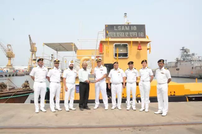 §भारतीय नौसेना के लिए 11x गोला बारूद के साथ टारपीडो सह मिसाइल (एसीटीसीएम) परियोजना के अंतर्गत ठाणे के सूक्ष्म, लघु एवं मध्यम उद्यम शिपयार्ड, मेसर्स सूर्यदिप्ता प्रोजेक्ट्स प्राइवेट लिमिटेड द्वारा निर्मित गोला बारूद सह टारपीडो सुविधा युक्त मिसाइल बार्ज नौका एलएसएएम 18 (यार्ड 128) को एनएडी (करंजा) के लिए 28 मार्च, 2024 को मुंबई के नौसेना डॉकयार्ड में सौंपा गया। इस महत्वपूर्ण समारोह की अध्यक्षता कमोडोर विक्रम बोरा, एनडी (एमबीआई)/जीएम (टेक) ने की थी।