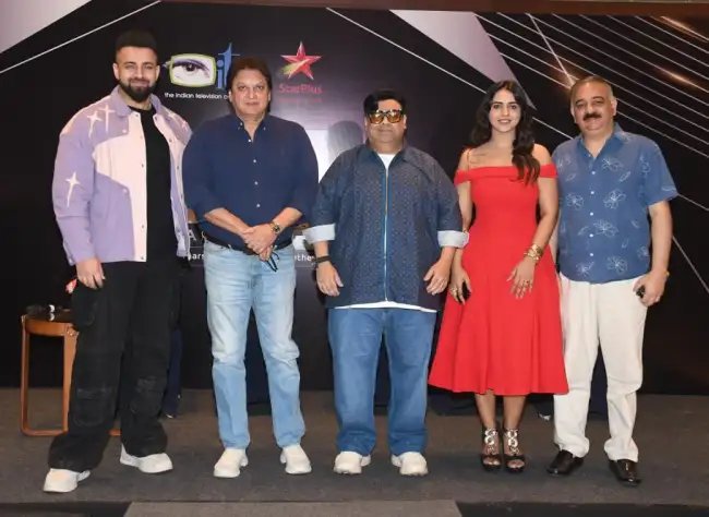 मंच पर एक ही फ्रेम में मनीष पॉल, रोहित रॉय, महिमा चौधरी, शुभांगी अत्रे, कीकू शारदा, ध्वनि पवार, जसवीर कौर, असित कुमार मोदी और माहिर पांधी जैसे जाने-पहचाने चेहरे—और पृष्ठभूमि में टेलीविज़न की 25 साल की