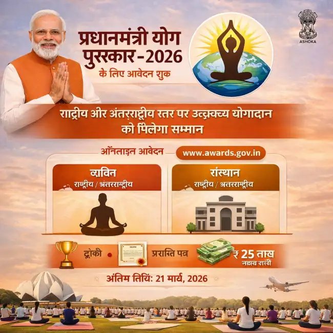 प्रधानमंत्री योग पुरस्कार–2026 के लिए आवेदन शुरू, राष्ट्रीय और अंतरराष्ट्रीय स्तर पर उत्कृष्ट योगदान को मिलेगा सम्मान