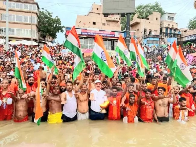 सावन के तीसरे सोमवार को तिरंगा लेकर कांवरिया बोले " सबका साथ हो गंगा साफ हो