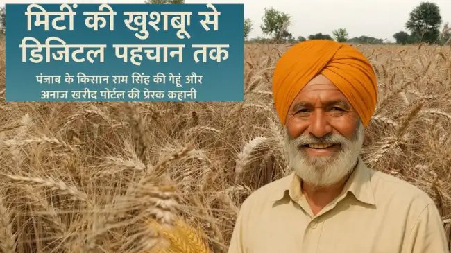 पंजाब के किसान राम सिंह की प्रेरक कहानी, जिसमें गेहूं की खेती, मेहनत, और अनाज खरीद पोर्टल के माध्यम से आत्मनिर्भरता और डिजिटल बदलाव को दर्शाया गया है।